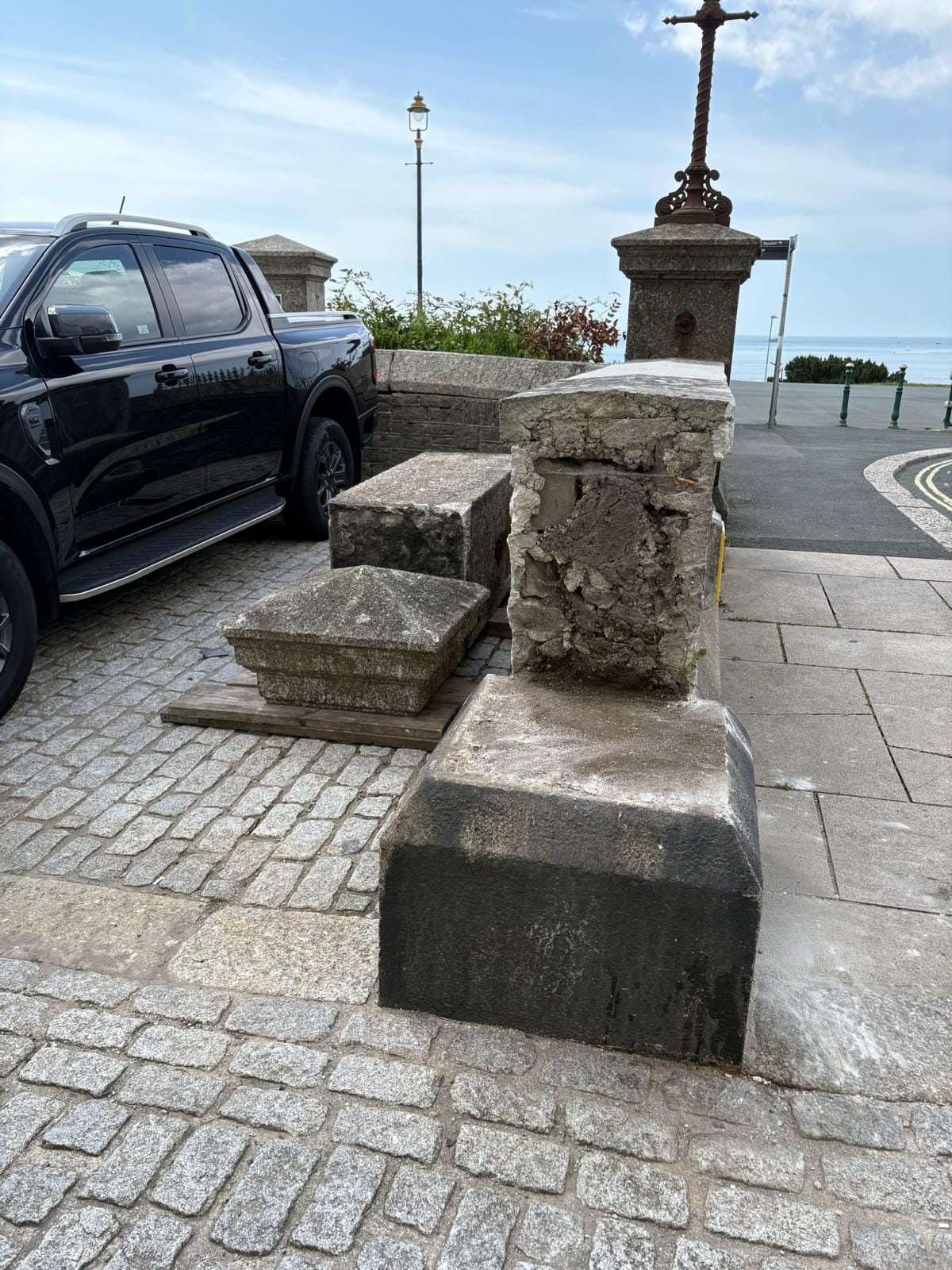 The heavy stone pillar toppled onto the pavement, and the large stone topping was knocked into the road.