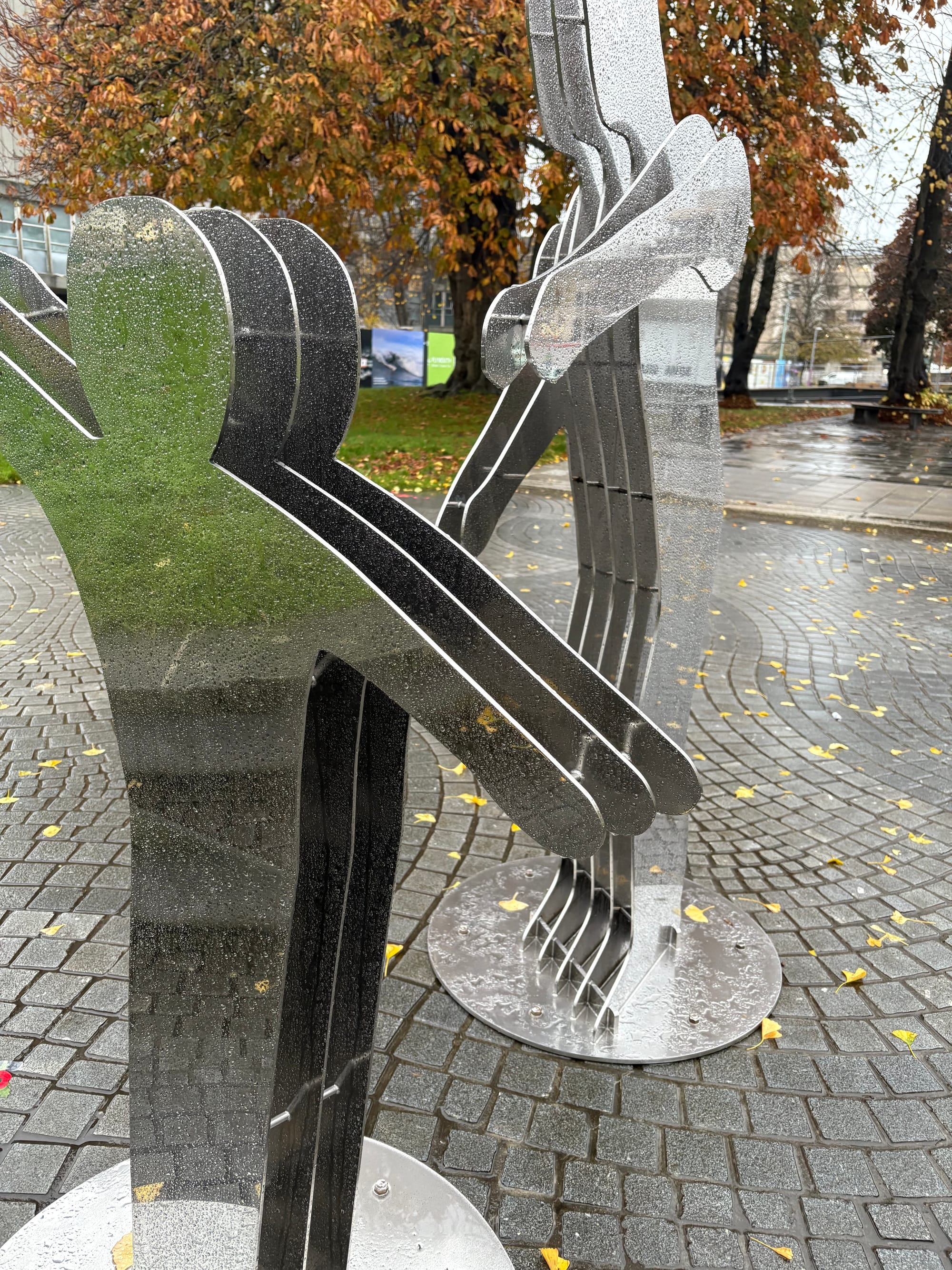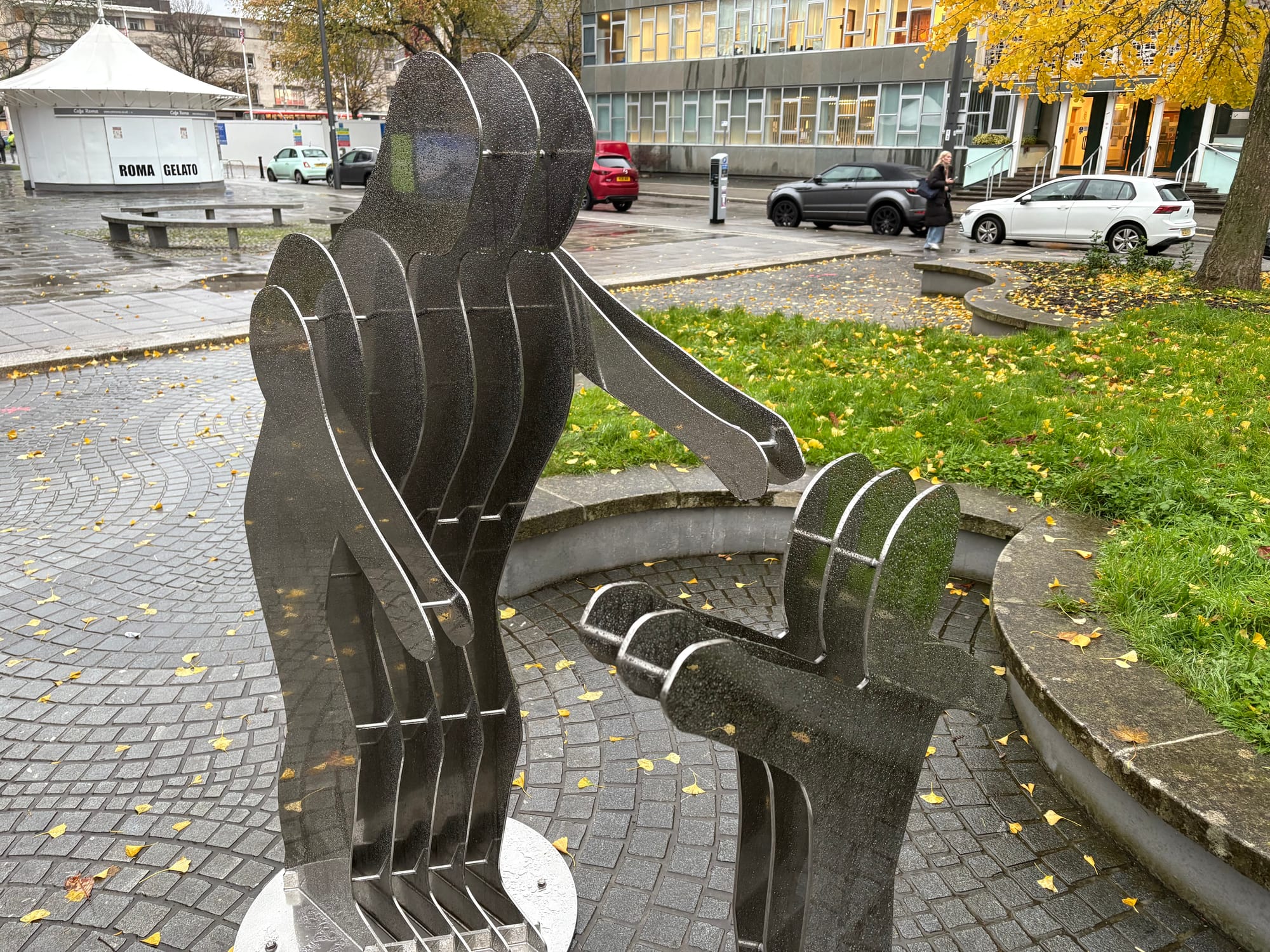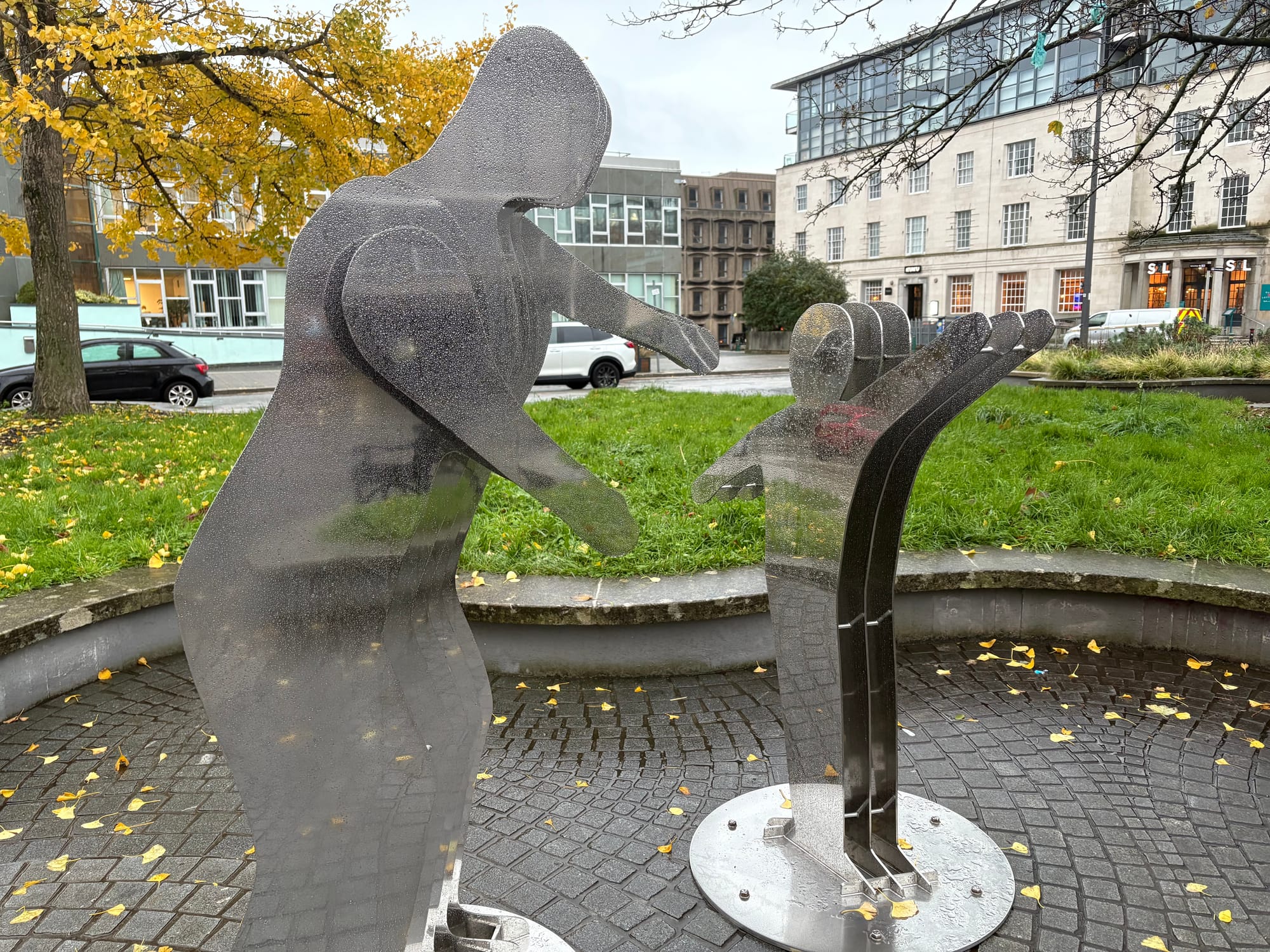 It depicts a parent and child, with the reflective surface of polished steel mirroring the people and surroundings of Plymouth, connecting the theme of reunion and remembrance to the city’s maritime heritage.