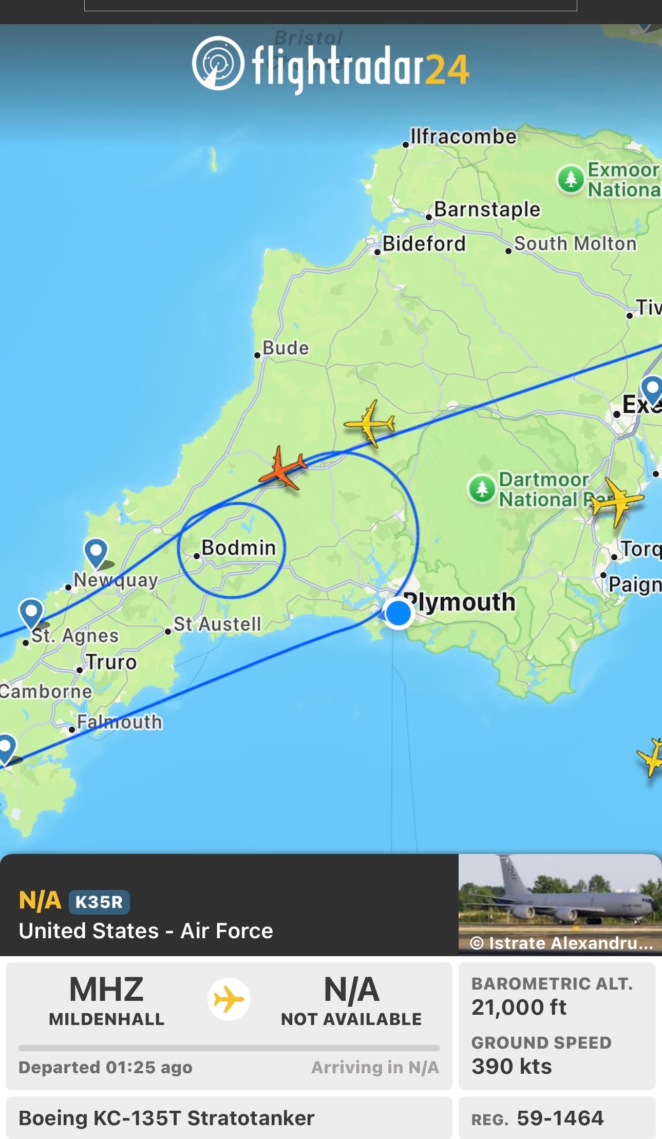 AARA (Air-to-Air Refuelling Area) corridors are pre-designated sections of airspace used specifically for mid-air refuelling operations — and one of these corridors sits right over Plymouth, the South West peninsula and nearby Atlantic approaches. This kind of circling pattern — often visible on tracking apps — is typical of tanker aircraft waiting to rendezvous with receiving aircraft.